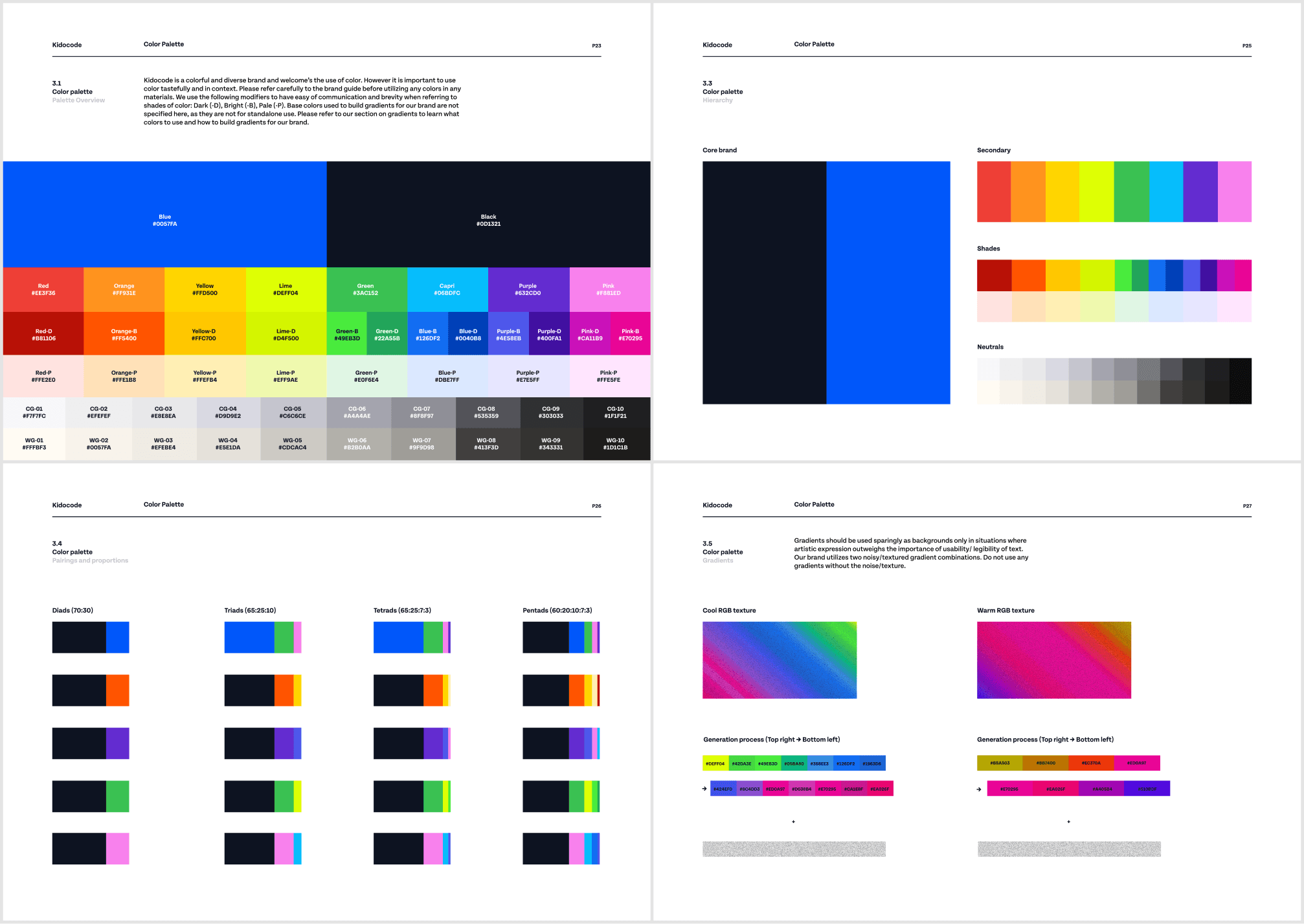 1. To establish a clear hierarchy, naming conventions, and usage patterns that could encompass the entirety of Kidocode's needs, which included brand colors, UI colors, and an illustration palette.