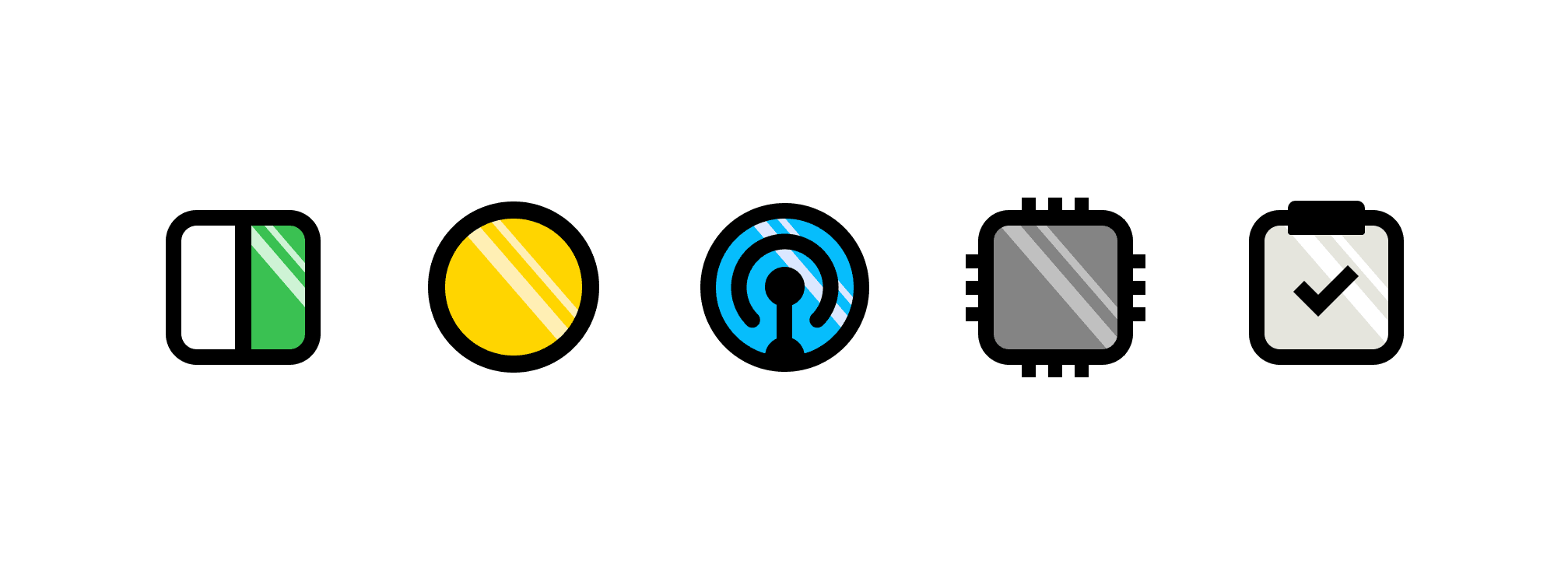 Our product icons, on the other hand, have a bit more personality and have flat colorful shapes as interior forms that do not have outlines. We chose this to provide an outlet for interesting abstract geometric forms to be used as part of our design language.